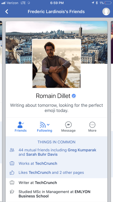 Once you tap on a button urging you to “get to know [name’s] friends” you’re cast into a carousel of the connections. Previously, the most prominent way Facebook orients you with potential new friends was by showing you your mutual friends. This option digs deeper, showing you events that you both attended, pages you both like, places you’ve both worked or lived.