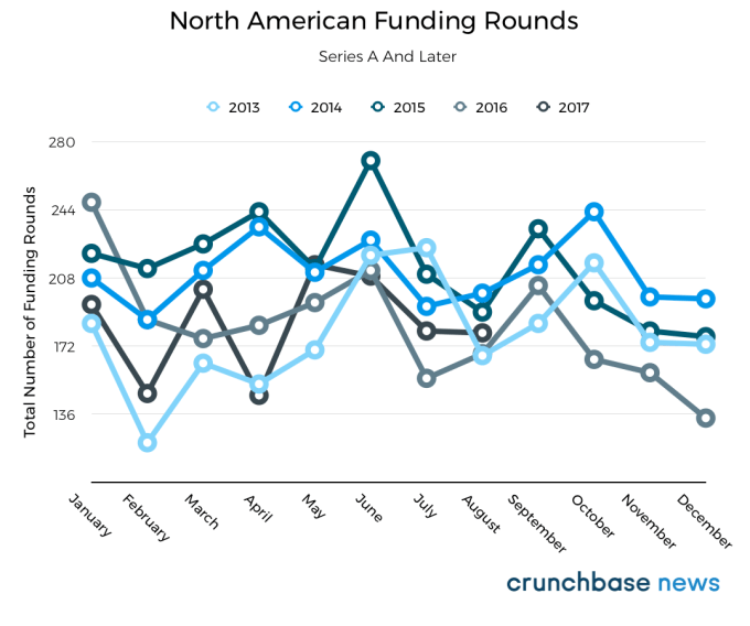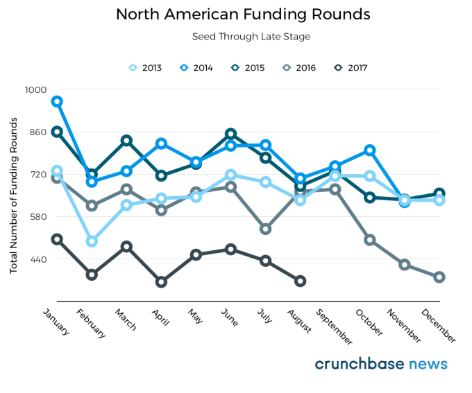 You can see that in the chart below, which shows the total number of seed and venture funding announcements for North American startups each month over the past five years: