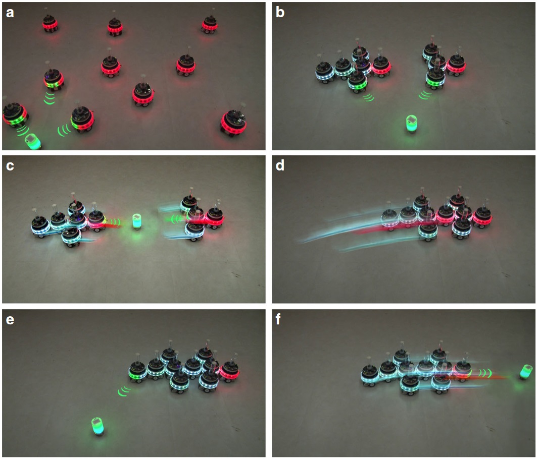 This has lots of advantages. First, there’s no need for an overarching intelligence that monitors and directs the robots, and all the infrastructure that implies. Second, it vastly simplifies the logic necessary to accomplish tasks: the “brain” issues commands and the “limb” robots execute them. Third, it makes replacing parts easy: if part of an arm isn’t working, swap it out; if the brain is destroyed, switch to the next one down the line. Fourth, it makes scaling the robots from five- or six-bot formations to hundred-bot formations… well, if not easy, then easier than before. And finally, adding functions like lifting or pushing is as easy as adding a lifter or pusher unit to the “organism.”
