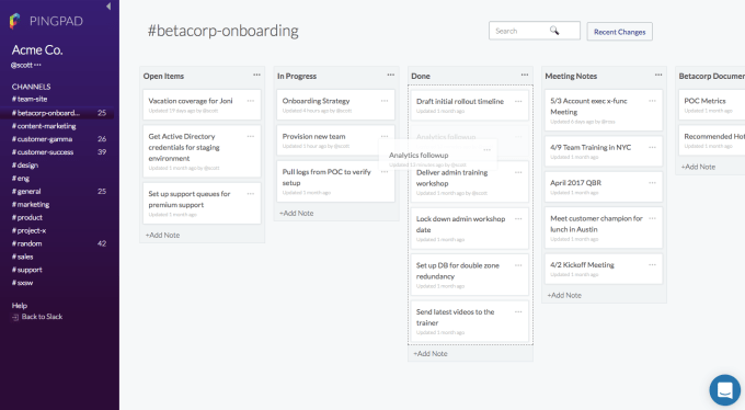 “Most companies we work with spend 80 percent of their time in Slack, but the conversational UI is a blessing and a curse,” Pingpad CEO and co-founder Ross Mayfield told TechCrunch. “Slack is great at communication, but it doesn’t support collaboration and coordination. We help you get Slack organized,” he explained.
