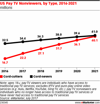 In addition, the so-called “cord-nevers” – meaning those consumers who never choose to subscribe to traditional cable or satellite TV in the first place – is growing, too. While the pace of that growth is slower – a more modest 5.8 percent this year – the total number of cord-nevers is higher. eMarketer says there will be 34.4 million U.S. adult cord-nevers in 2017.