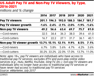 This year, over 196.3 million U.S. adults will watch pay TV (meaning cable, satellite or telco) – a figure that’s down 2.4 percent over 2016. But by 2021, that figure will have dropped nearly 10 percent, compared to five years earlier, to reach 181.7 million.
