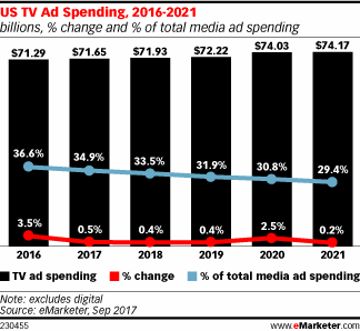 Because of this shift in viewership, the pay TV ad market is now starting to feel the pain of cord cutting, too, the report said. U.S. TV ad spending this year will grow just 0.5 percent to $71.65 billion, a figure that’s down from eMarketer’s prior forecast earlier this year of $72.72 billion.