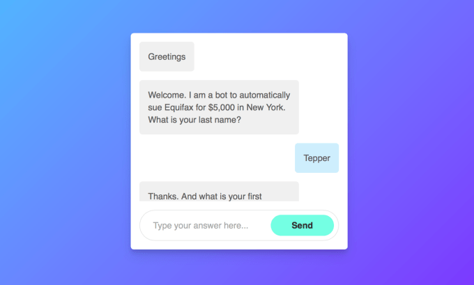This chatbot is an extension of DoNotPay, a bot designed to get you out of parking tickets. The founder, Joshua Browder, said he hopes his service “will replace lawyers, and, with enough success, bankrupt Equifax.”