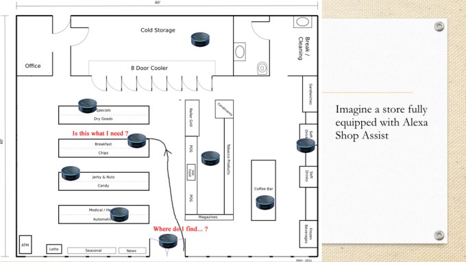 In that sense, Alexa wouldn’t just replace the “aisle finder” function of a retail store’s shopping app – she could actually answer the basic questions that you might otherwise ask a store employee. That’s not to say that the overall idea here is to replace store staff with technology (though that is something Amazon is experimenting with today in its concept, cashier-free “Go” stores.)