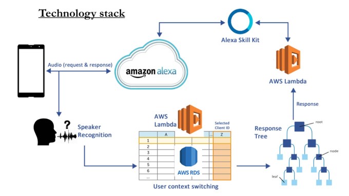 The system utilizes two AWS Lambda functions, speaker recognition, and a context switched response tree. This is all tied together through an iOS app, which uses the Alexa Skill Set and Alexa Voice Service.