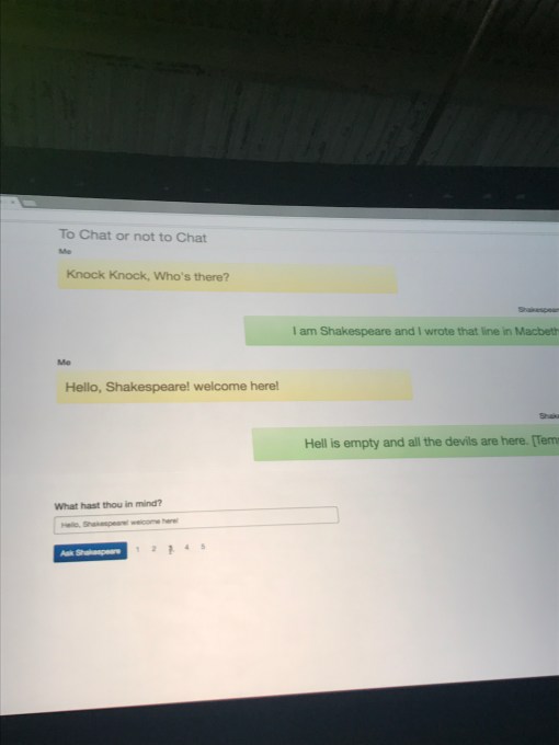 The end result is an effective conversation that you can have with a bot that not only speaks with you, but speaks in Shakespeare lines: