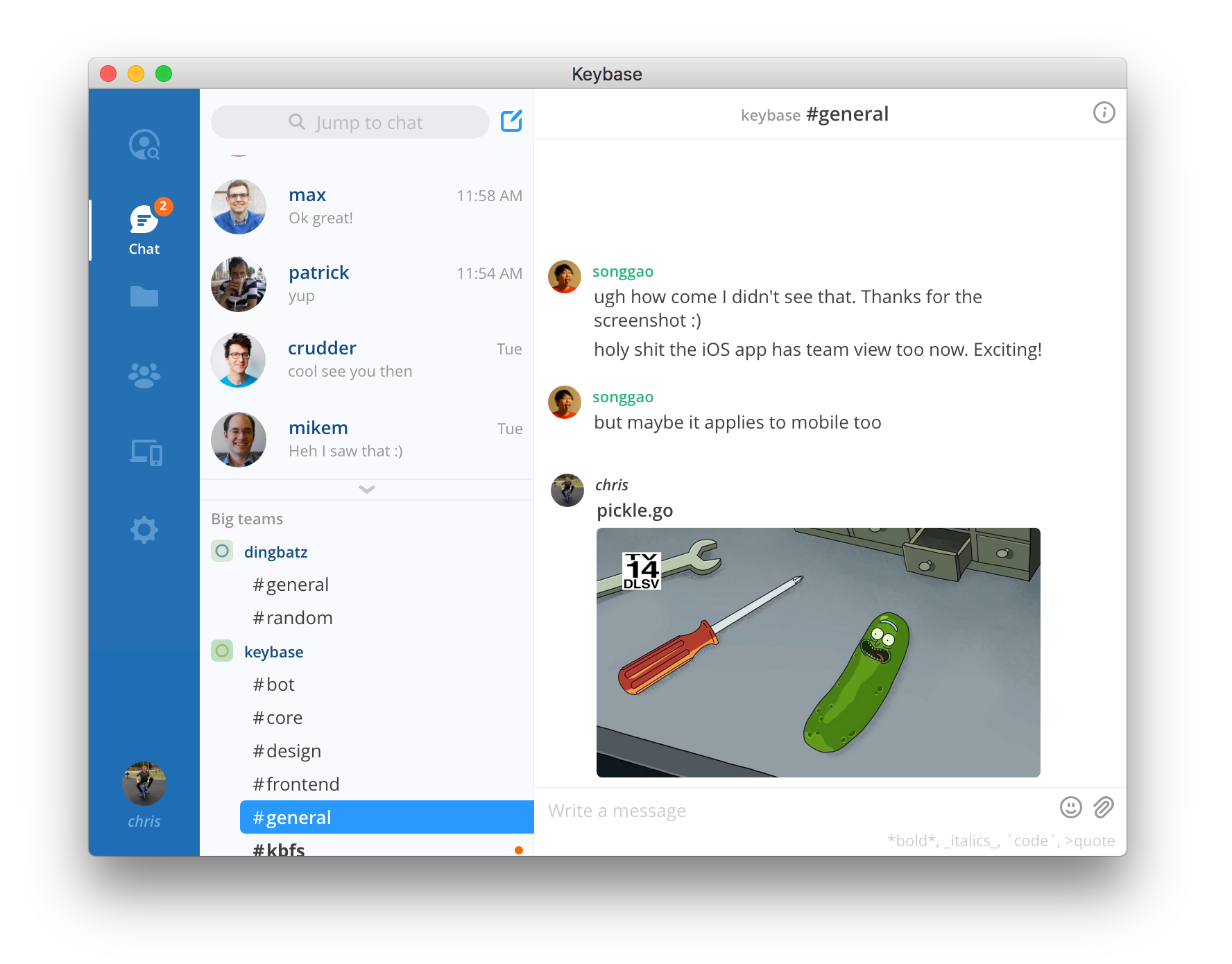 It works just like any other communications tool of this ilk. You create a Keybase Team and begin generating chats and channels. You can also share encrypted files with the team. The interface should have a familiar look and feel.