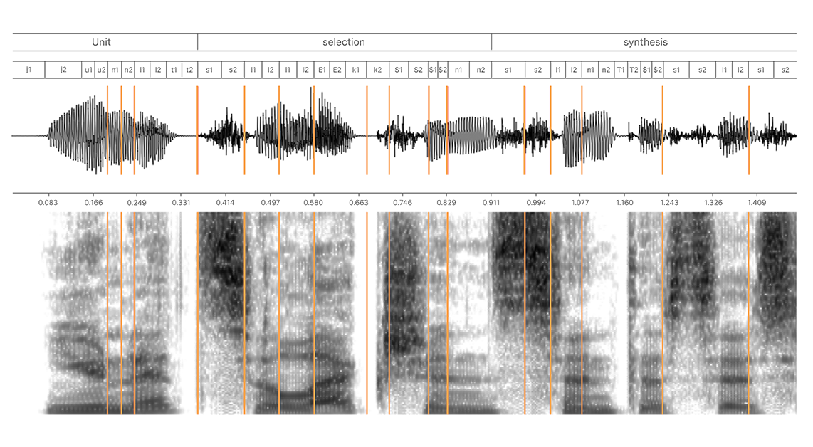 That speech was then segmented into tiny pieces called half-phones; phones are the smallest sounds that make up speech, but of course they can be said in different ways — rising, falling, quicker, slower, with more or less aspiration, that kind of thing. Half-phones… well, obviously, they’re half a phone.
