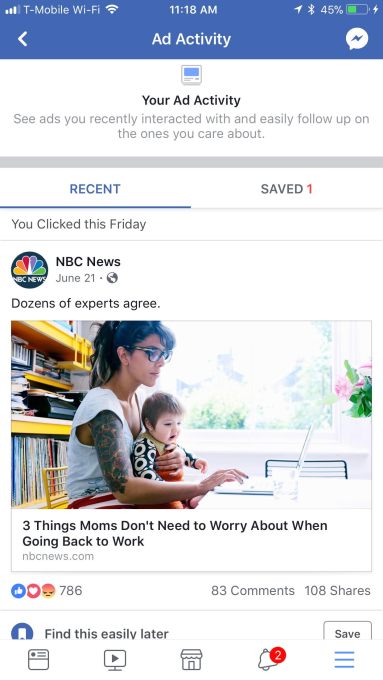 Recent Ad Activity appears to show the past three months or so of ads you clicked, liked, commented on or shared. There’s also a tab for ads you purposefully saved.