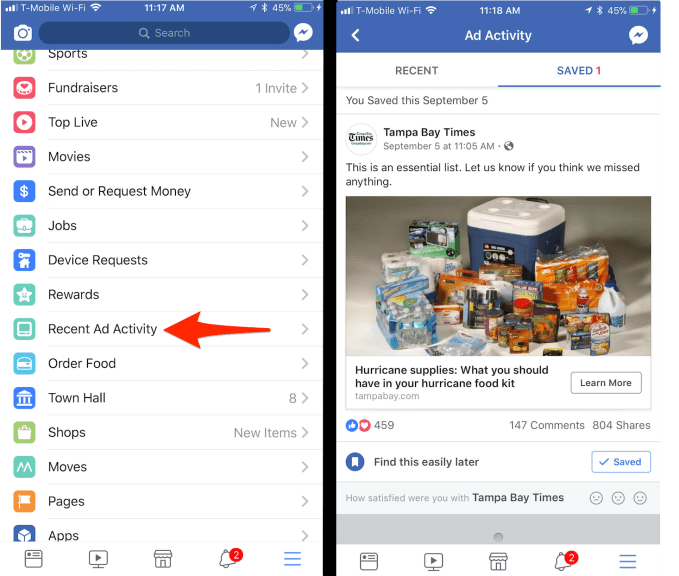 TechCrunch inquired with Facebook about the feature after Matt Navarra shared a screenshot, and now the company admits that Recent Ad Activity has been fully rolled out in the US. Facebook tells us it’s considering what other countries to test the feature in. You can find Recent Ad Activity in the bookmarks sidebar of Facebook’s mobile apps and desktop site.