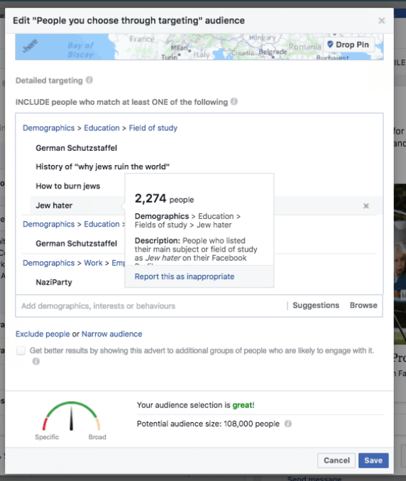 Facebook has also clarified its rules against offensive ad targeting, and will step up enforcement with more human moderators. It’s also working on a way for people to be able to report potential abuses of its ad product the way people can with Facebook’s user interface and technical systems.