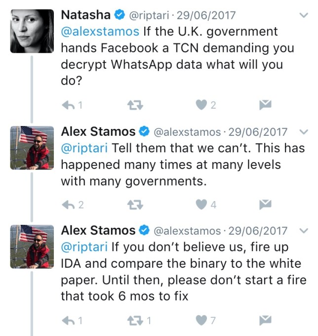 Facebook CSO Alex Stamos also previously told us the company would refuse to comply if the UK government handed it a so-called Technical Capability Notice (TCN) asking for decrypted data — on the grounds that its use of e2e encryption means it does not hold encryption keys and thus cannot provide decrypted data — though the wider question is really how the UK government might then respond to such a corporate refusal to comply with UK law.