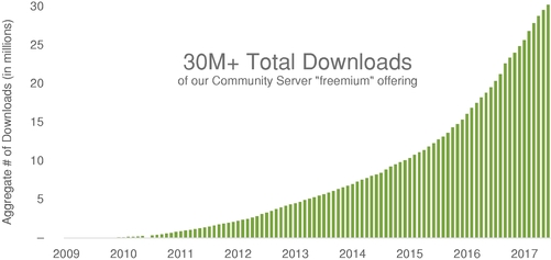 MongoDB says that people have downloaded its Community Server “freemium” offering more than 30 million times, and that seems to have been growing pretty consistently over the past several years: