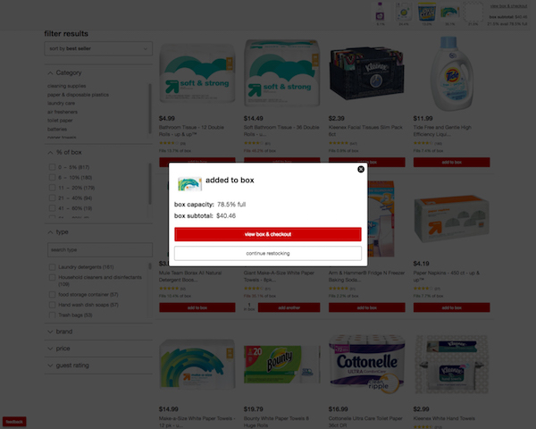 The company says that during its test period, shoppers have most regularly been using the service to order on-the-go snacks, beverages, cereal, mac and cheese, and paper towels – an early indication that people are doing at least some of their online grocery shopping via Target Restock.