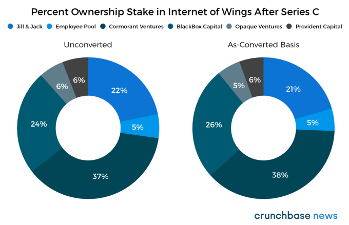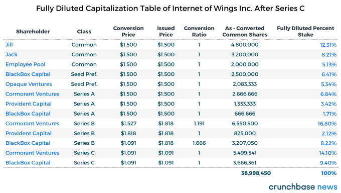 In the past, we haven’t included a conversion price in our capitalization tables because preferred shares would convert to common shares on a one-to-one basis. But because IoW has now experienced a down round, this parity is now broken and we’ll have to include the conversion price. This also gives us the opportunity to calculate Internet of Wings’s ownership on an as-converted basis.