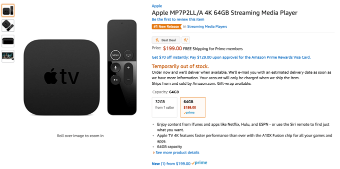 The product listing for the Apple TV on Amazon was first spotted by 9to5Mac, which noted the 64 GB Apple TV 4K ($199) was added to Amazon’s site in the last couple of days. It’s also not a third-party listing, and can be added to shoppers’ carts now even if it’s “out of stock.” (Appleinsider also found a 32 GB model available, but said it appeared to be from a gray-market seller.)