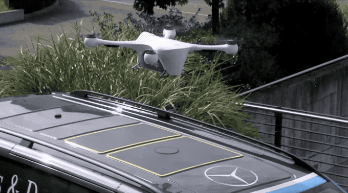 For this demonstration, the drone flew at about 260 ft in the air, and is designed to operate in this band for safety purposes. It flies consistently at this height all the way to the destination, and then it descends to land on the roof of a Mercedes-Benz van, which emits a signal to guide it in precisely and take over from GPS, which alone has a larger margin of error.