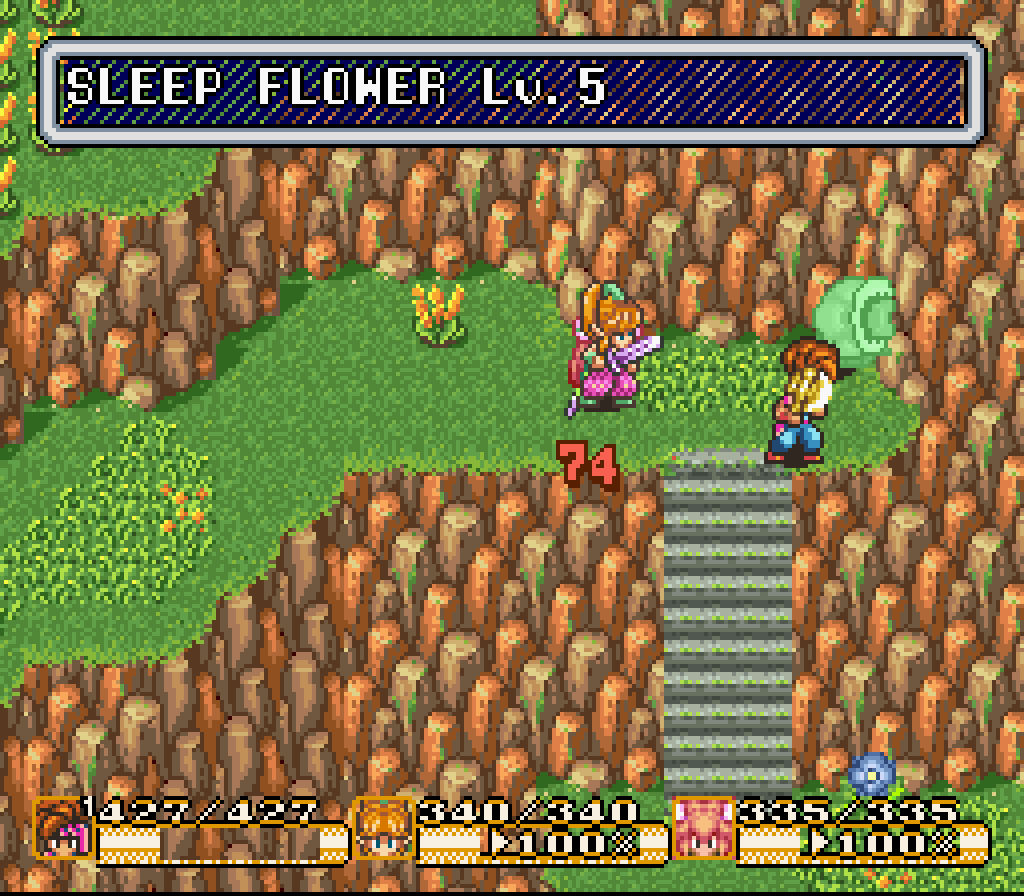 A new feature in the SNES CE is the “Rewind” function. Select a game suspend state (say the boss one) and instead of hitting start, hit X. The game will start up some amount of time before you hit reset. You can then skip forward and back in time with the R and L buttons. This is in case you want to go back to before an enemy encounter you messed up but don’t want to load up your save from half an hour back.