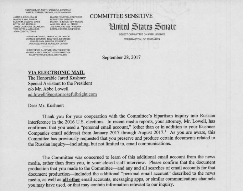 CNN is reporting that the chair and vice-chair of the Intelligence Committee drafted a letter to Kushner’s lawyer requesting that the legal team for the President’s adviser and son-in-law double-check and ensure that they have turned over every relevant document to the committee.