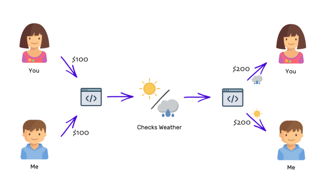 If A and B place a bet about the next day’s weather, the bet can be carried out in a trustless manner using a smart contract. Both of them can submit their betting amounts to the smart contract. At a predefined time on the next day, the contract will make an API call to the Open Weather API to see if the weather is sunny or rainy. Depending on the weather, the total amount will be sent to either of the two.