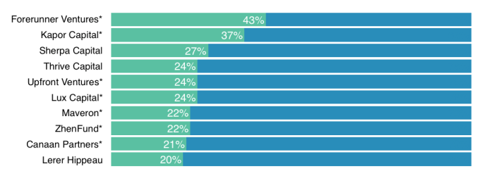 At the top of the list are two firms with female venture partner founders, Kirsten Green at Forerunner Ventures (43 percent in 22 companies) and Freada Kapor at Kapor Capital (37 percent in 37 companies). Other firms that over-indexed include Sherpa Capital at 27 percent (23), Upfront Ventures at 24 percent (20) portfolio companies, Thrive Capital at 24 percent (17), Lux Capital at 24 percent (15), Maveron at 22 percent (16), ZhenFund at 22 percent (18), Canaan Partners at 21 percent (24) and Lerer Hippeau Ventures at 20 percent (35). Of these eight firms, five have female investing partners, including Lux Capital, Upfront Ventures, Maveron, Canaan Partners and ZhenFund.