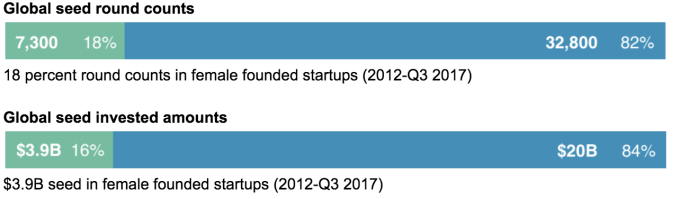 - Sixteen percent of seed dollars globally between 2012 and Q3 2017 went to startups with at least one woman founder.