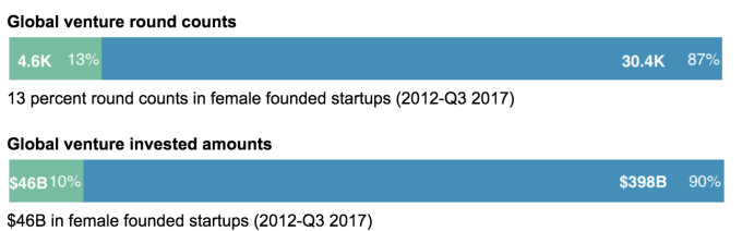 - Ten percent of venture dollars globally between 2012 and Q3 2017 went to startups with at least one woman founder.