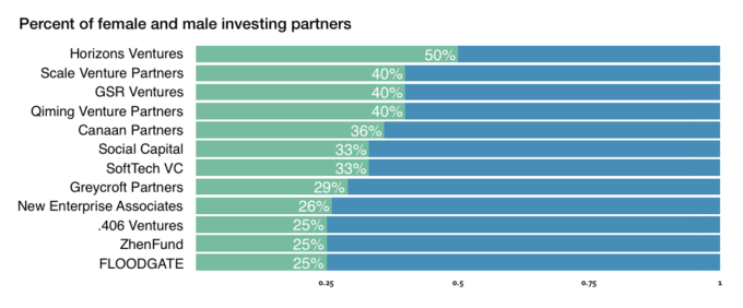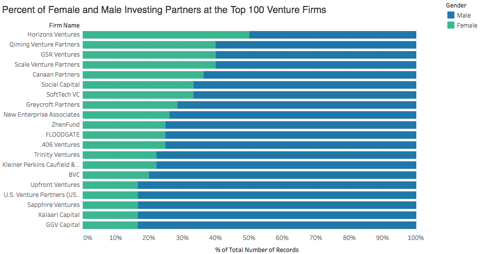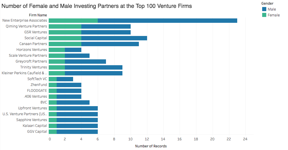 When we looked at the male/female ratio among investing partners at the top 100, Horizons Ventures topped the list with 50 percent female partners out of four partners. A further 6 of the 100 top firms have 30 percent or more female partners including Scale Venture Partners, GSR Ventures, Qiming Venture Partners, Canaan Partners, Social Capital, and SoftTech VC. Two of these seven firms, Horizons Ventures, and Scale Venture Partners, were founded by women.Three of the seven firms with the highest percentage of female partners are based in Hong Kong or China.