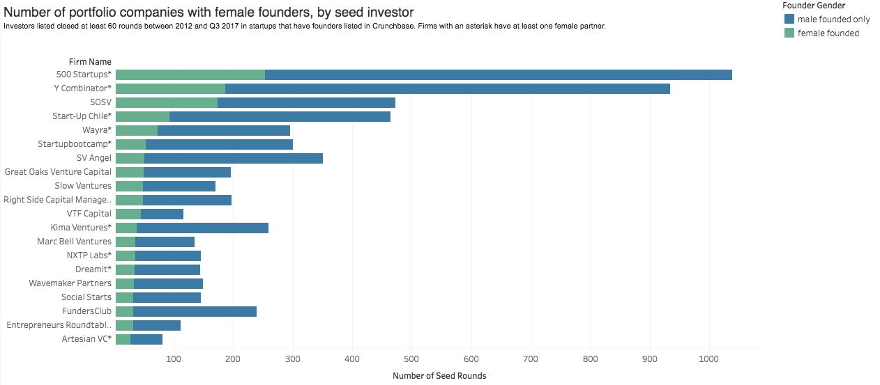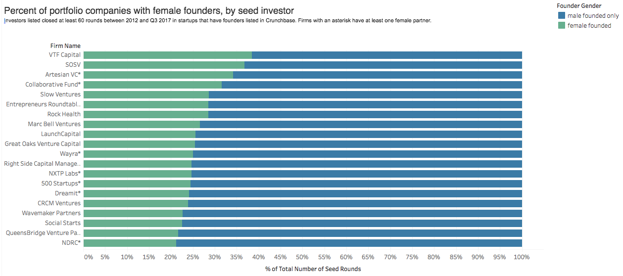 We ran the same analysis on seed investors, where, as we noted above, some 18 percent of all rounds in Crunchbase went to firms with female founders. We looked at firms that closed at least 60 rounds between 2012 and Q3 2017 in companies whose founders we were able to identify in Crunchbase in at least 75 percent of cases.