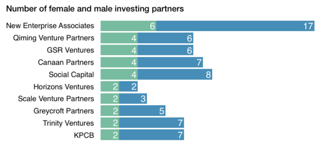 We also looked at which firms have the most female venture partners. At the top of the 42 firms stands NEA (6), Qiming Venture Partners (4) and GSR Ventures (4), both based in China, Canaan Partners (4), and Social Capital (4). A further five firms have two investing partners, and 32 firms have a single female investing partner.