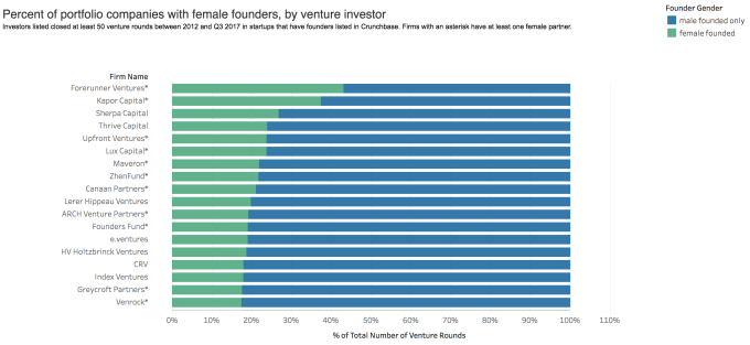 To get a closer look at venture firms investing in female founders, we compiled a list of firms with investments in at least 50 companies made between 2012 and Q3 2017 to determine which firms over-indexed against the top 100’s 13 percent in venture rounds made to female founders. (We only looked at firms where we could identify at least 75 percent of the founders for the firm’s portfolio.)