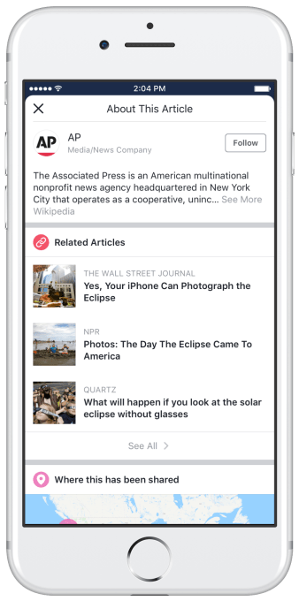 This box will display the start of a Wikipedia entry about the publisher and a link to the full profile, which could help people know if it’s a reputable, long-standing source of news…or a newly set up partisan or satire site. It will also display info from their Facebook Page even if that’s not who posted the link, data on how the link is being shared on Facebook, and a button to follow the news outlet’s Page. If no Wikipedia page is available, that info will be missing, which could also provide a clue to readers that the publisher may not be legitimate.