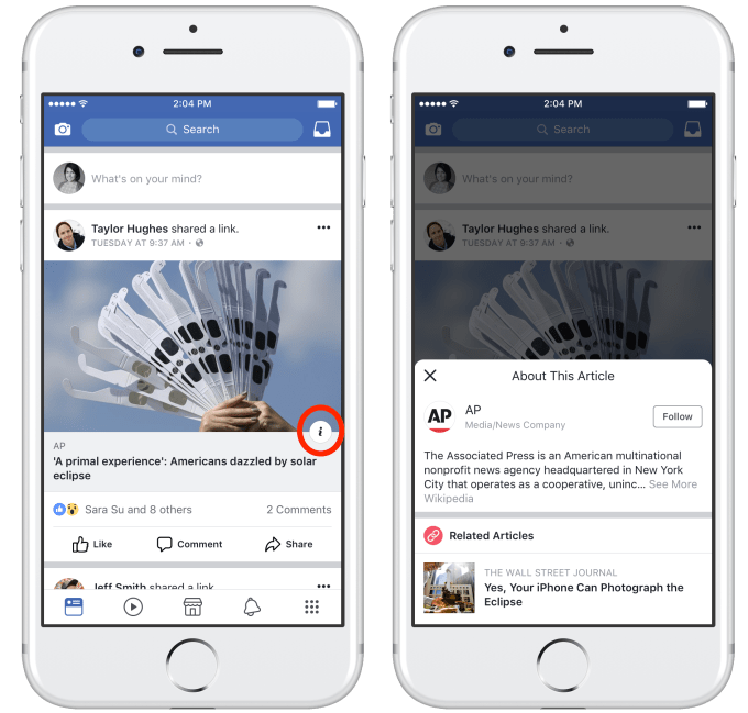 Facebook thinks showing Wikipedia entries about publishers and additional Related Articles will give users more context about the links they see. So today it’s beginning a test of a new “i” button on News Feed links that opens up an informational panel. “People have told us that they want more information about what they’re reading” Facebook product manager Sara Su tells TechCrunch. “They want better tools to help them understand if an article is from a publisher they trust and evaluate if the story itself is credible.”