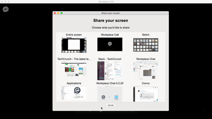 What’s totally new to Facebook is screen sharing. As Facebook evolves from text towards visual communication, being able to show people what you’re looking at could be an important complement to video chat. While Slack only added screen sharing in May over four years after launch, Workplace now has it less than a year after its debut.