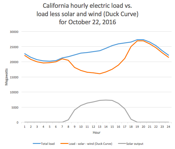 While solar is seeing a rapid reduction in costs, a critical issue remains — when the sun is out, people tend to use less energy. The chart below illustrates the challenge in California.