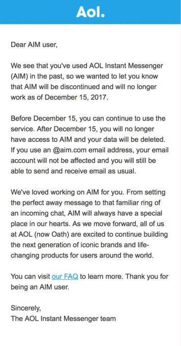 “We know there are so many loyal fans who have used AIM for decades; and we loved working and building the first chat app of its kind since 1997,” AOL wrote on the AIM help page. “Our focus will always be on providing the kind of innovative experiences consumers want. We’re more excited than ever to focus on building the next generation of iconic brands and life-changing products.”