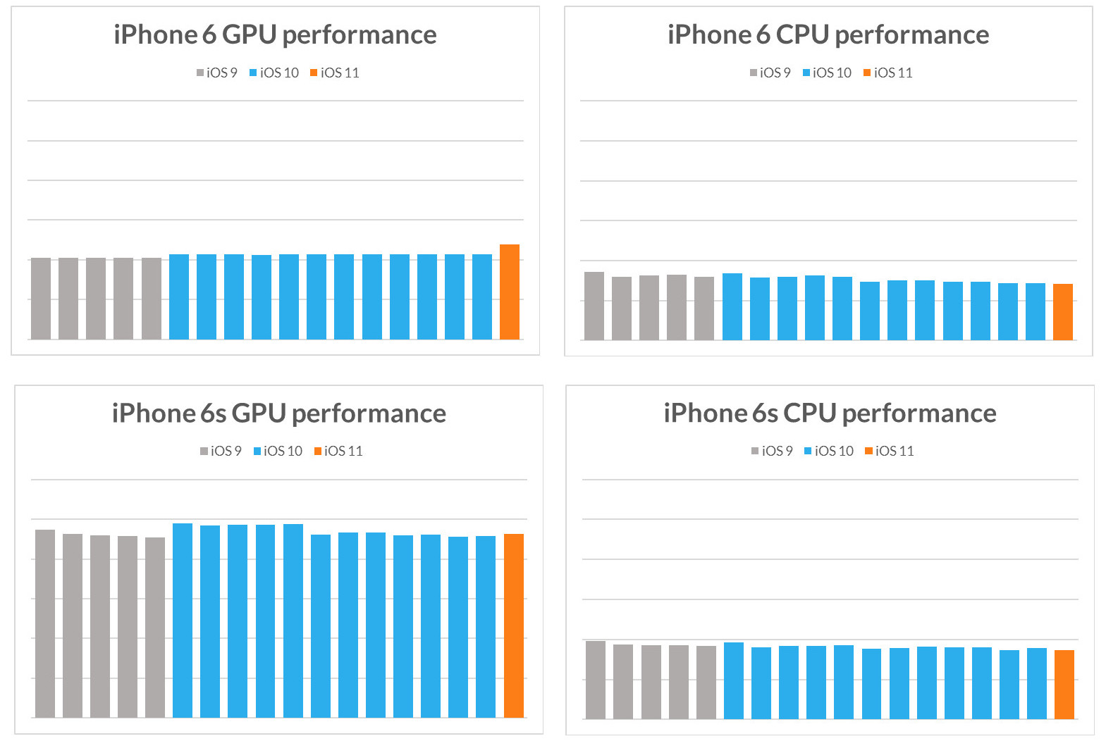 Futuremark’s analysts aggregated the last couple years of scores for the iPhone 5s, 6, 6s and 7, to see whether it was true that iOS releases or new iPhones tended to coincide with (or trigger) drops in performance.