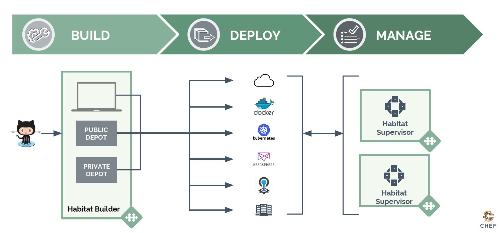 Habitat Builder offers a build service and an artifact store with public and private repositories for holding the packaged app and their desired deployment architectures, as well as support for the Habitat Supervisor for managing the runtime lifecycle, configuration updates and more.