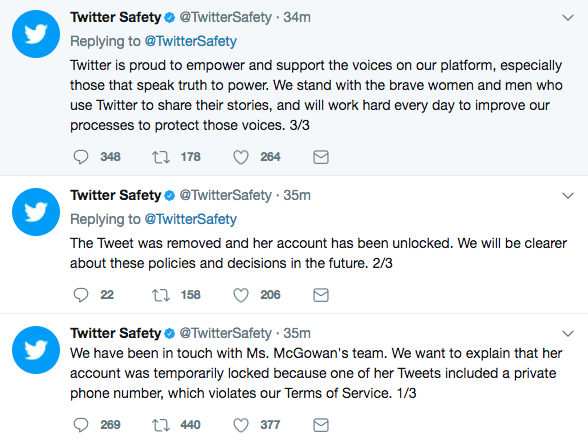 Yet now the Twitter Safety account has publicly tweeted to say McGowan’s account was “temporarily locked because one of her Tweets included a private phone number, which violates our Terms of Service” — apparently selectively breaking its own rule about not commenting on individual accounts.