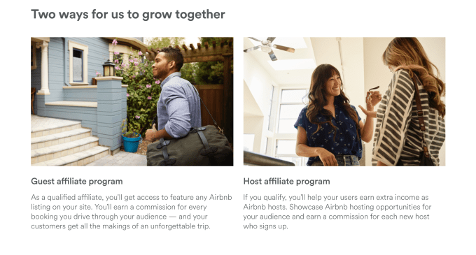 “Earn commissions and provide more choices to your users,” Airbnb writes, with one affiliate option aimed at attracting guests, and other aimed at attracting hosts (in other words, those who would list properties or other services on Airbnb) — the two parts of Airbnb’s two-sided marketplace.