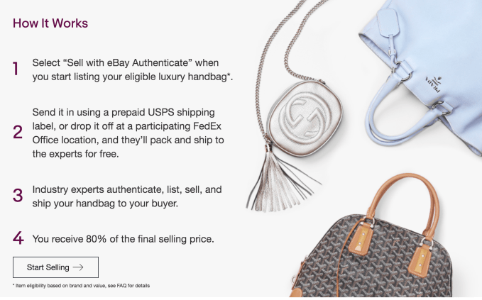 To use the service, sellers visit the eBay Authenticate website to start listing their item, then send in the handbag or wallet using the prepaid shipping label or drop it off at FedEx. The FedEx office will pack and ship the item to the experts for free, says eBay.