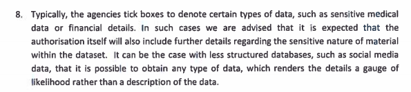 It did specify that the stored and searchable data can include details such as an individual’s religion, racial or ethnic origin, political views, medical condition, sexual orientation, and legally privileged, journalistic or “otherwise confidential” information. It also specified that BPDs “vary in size from hundreds to millions of records”, and can be acquired by “overt and covert channels”.