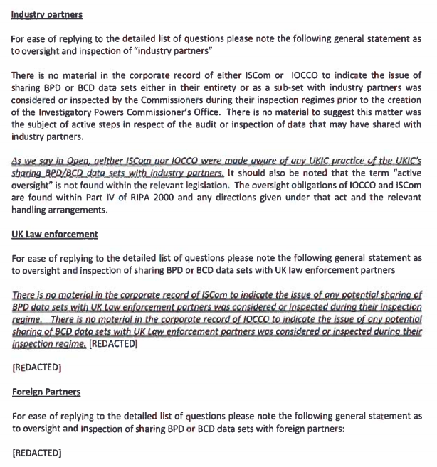 Part of the UK government’s defense to the group legal challenge over intelligence agencies’ use of BPDs is that there are effective safeguards in place to prevent misuse. But Privacy International’s contention is that the new documents show otherwise — with the IPCO stating the Commissioner was never made aware of any practice of GCHQ sharing bulk data with industry.