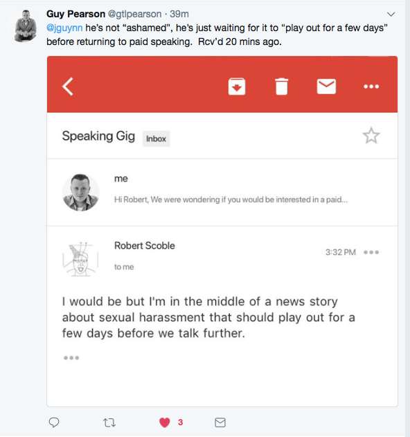 *Update: Minutes after publishing this article, Scoble has on his Facebook profile offered an apology for his past and recent behavior, saying, “I have damaged the trust many people had in me. I have made many steps in my life to try to improve, including getting sober more than two years ago. I have committed to making amends where appropriate and to living a life of transparency, integrity, and honesty.”