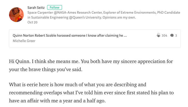 After journalist Quinn Norton recently published her Medium post accusing Scoble of grabbing her, NASA analyst Sarah Seitz said in the post’s comment section that Scoble had propositioned Seitz for an affair a year and a half ago — after he’d publicly stated that he was cleaning up his act.
