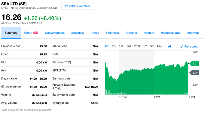Sea, the gaming and e-commerce company holding the first major U.S. IPO from a Southeast Asian tech firm, had a bumpy start to life on the NYSE after closing the day up around eight percent on its list price of $15.
