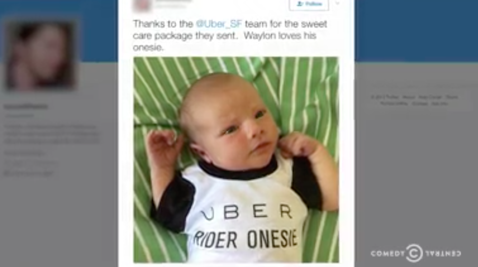 The reason? Fielder’s cab driver friend Andy believes Uber stole his idea to offer baby onesies to any woman who gives birth in his cab. Andy is convinced the offering is good for business…for some reason.
