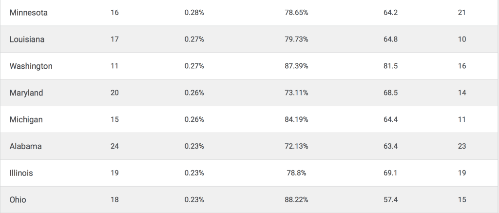 The numbers don’t lie. We see the usual suspects appearing high on the list including Texas which dropped from the number one spot a year ago. What’s more interesting is who makes up the middle of the pack. Places like Michigan and DC, for example, are inching up the rankings while places like Chicago are stagnant.