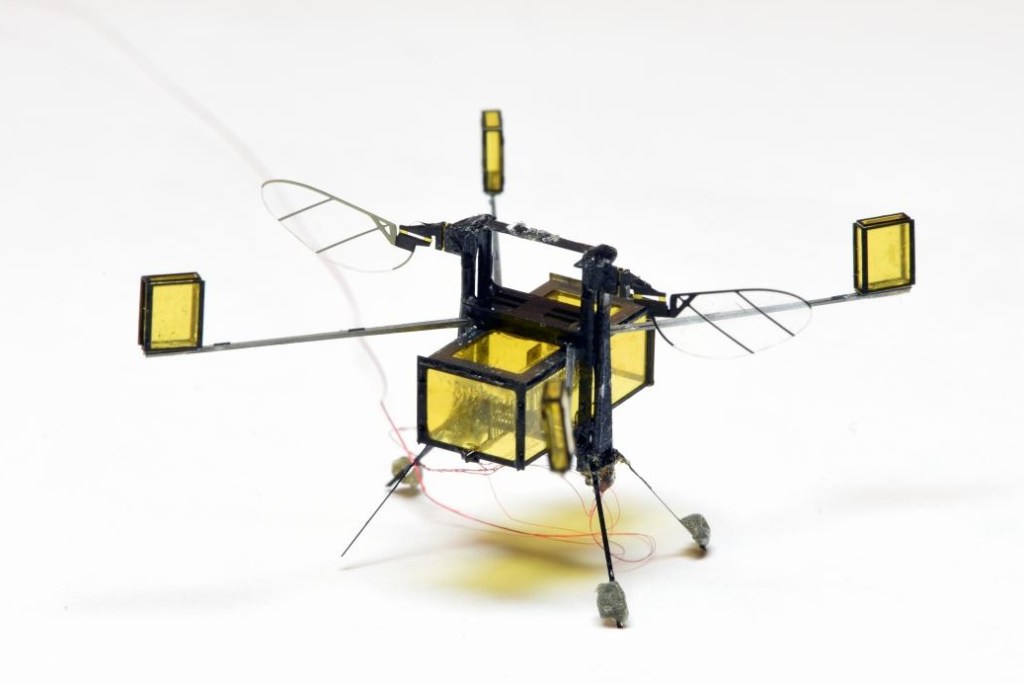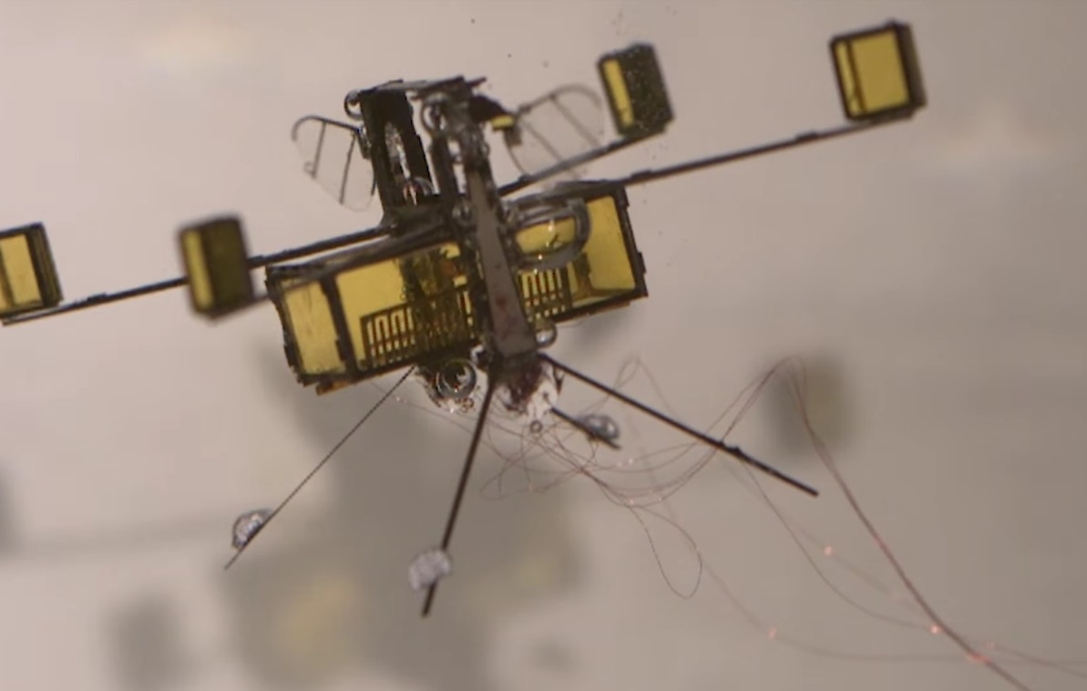 The whole thing, meanwhile, weighs a total of 175 milligrams — almost twice as heavy as previous designs (the floaties and so on add quite a bit of mass), but still incredibly small. Redesigns added to the platform’s potential payload, though, so the mass used by these water-specific items could also be used instead to deploy sensors or even a battery that would free it from its wired tether.
